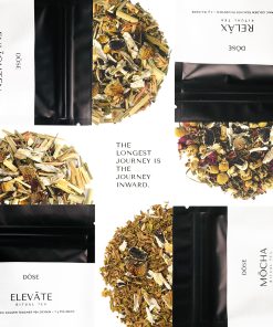 DÖSE ELEVATE RITUAL TEA is offered to boost your mood to incredible heights. A blended green & white tea infused with bursts of citrus— aromatic notes of lavender and the sweet scent of jasmine to accentuate your magical mushroom journey. This specially curated organic tea blend will mask the taste of mushroom beautifully while mitigating instances of nausea and upset stomach through the steeping process. Ingredients: zesty bergamot, kaffir lime citrus, lemon balm, green + white tea leaves, lavender, jasmine + one gram golden teacher mushroom